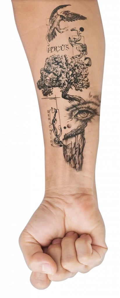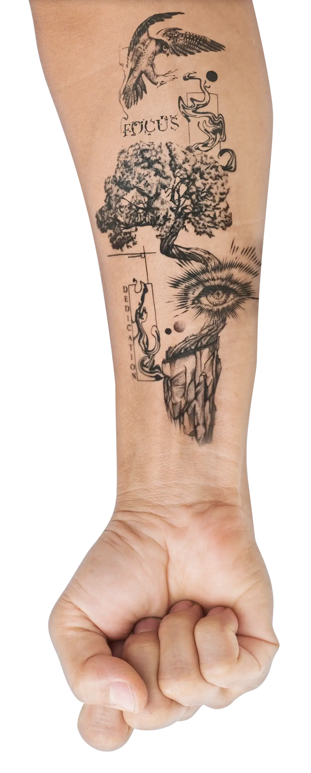 Dein Motiv wird zum Termintag vorbereitet. Wir schicken in der Regel keine Zeichnungen und Entwürfe vorher heraus. Wir besprechen am Termintag dann Fragen wie genaue Größe und Platzierung in Ruhe vor Ort. Wir planen Termine zeitlich großzügig und somit sind kleinere Änderungen in der Regel problemlos umzusetzen. Tätowiervorgang und Nachsorge besprechen wir ausführlich mit Dir. Komme entspannt, ausgeschlafen und gerne mit etwas Nervennahrung im Gepäck an und mache Dich nicht verrückt!