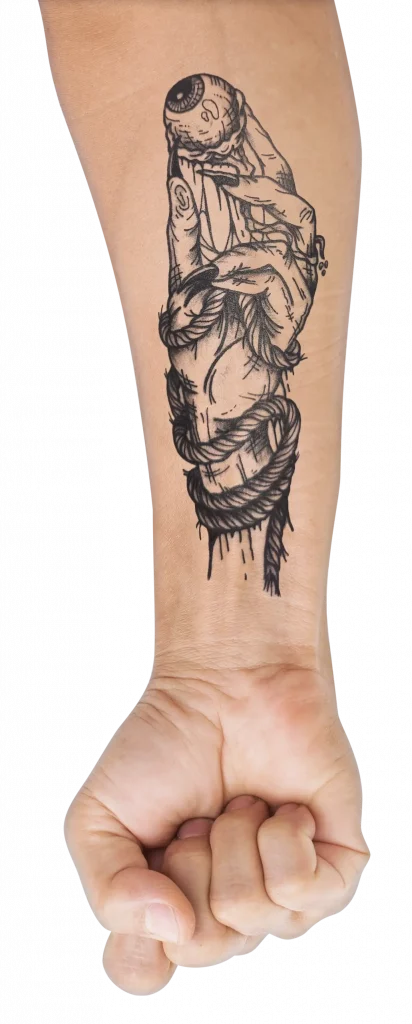 Dark-Art- und Horror-Tattoos mit übernatürlichen und gruseligen Motiven in schwarz/grau.