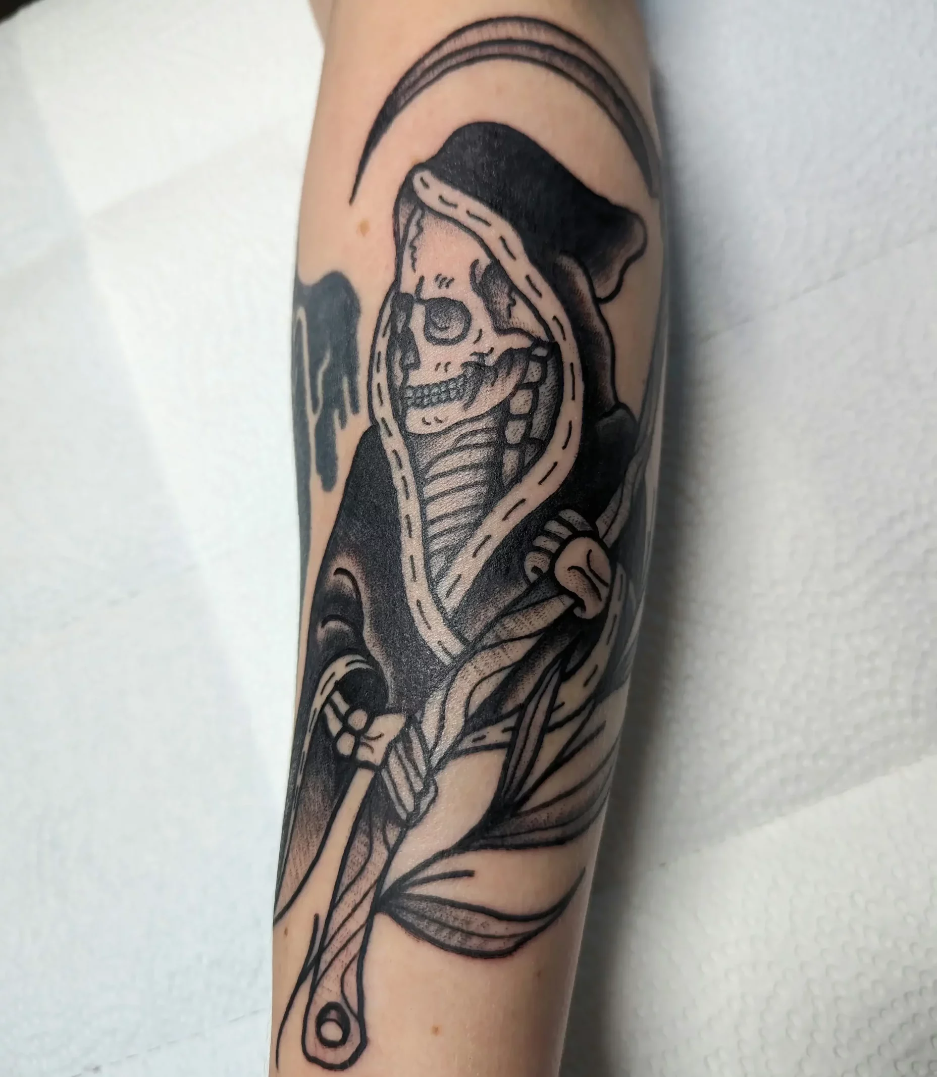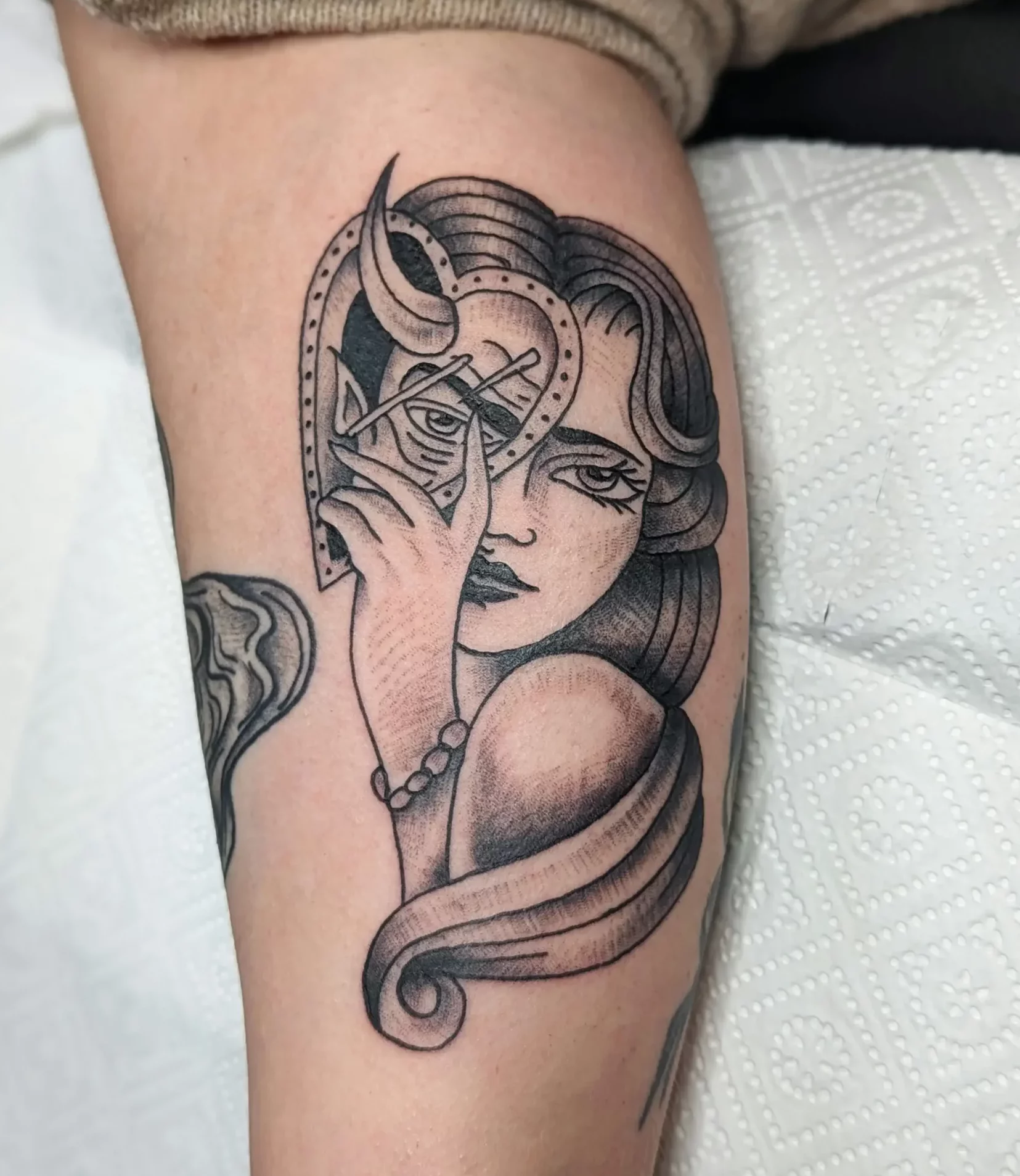 Dark-Art- und Horror-Tattoos mit übernatürlichen und gruseligen Motiven in schwarz/grau.